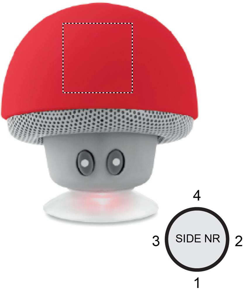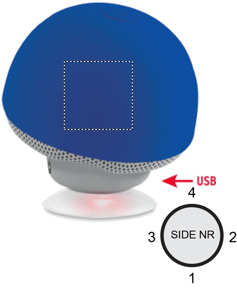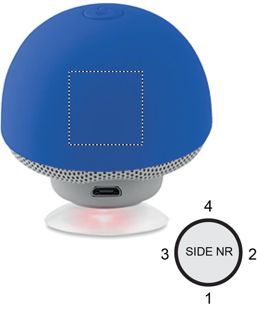 Trådlös högtalare i svampform. Högtalaren kan fästas på en slät yta eller användas som telefonställ. Materialet är ABS med sugpropp i gummi. Innehåller ett laddningsbart 180 mAh Li-ion batteri. USB-laddningskabel ingår. 3 ,5 mm hörlurskontakt. Output: 4 Ohm, 5V och 3W. Speltid ca 2 timmar.
