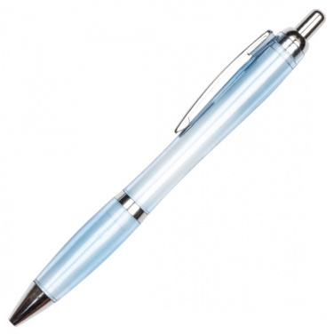 Klassisk kulpenna gjord av återvunnen PET, transparent med silverapplikationer och blå skrivpåfyllning med stor kapacitet. Din logotyp kommer att skrivas ut till höger om klippet.